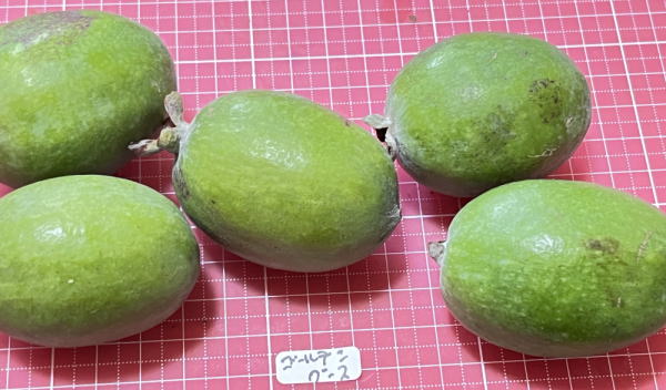 味が大変よく、石細胞はありますが弱く、くせも少なく「おいしーい」と言える品種です。フェイジョアの多くの品種の中で、トップクラスのおいしさです。